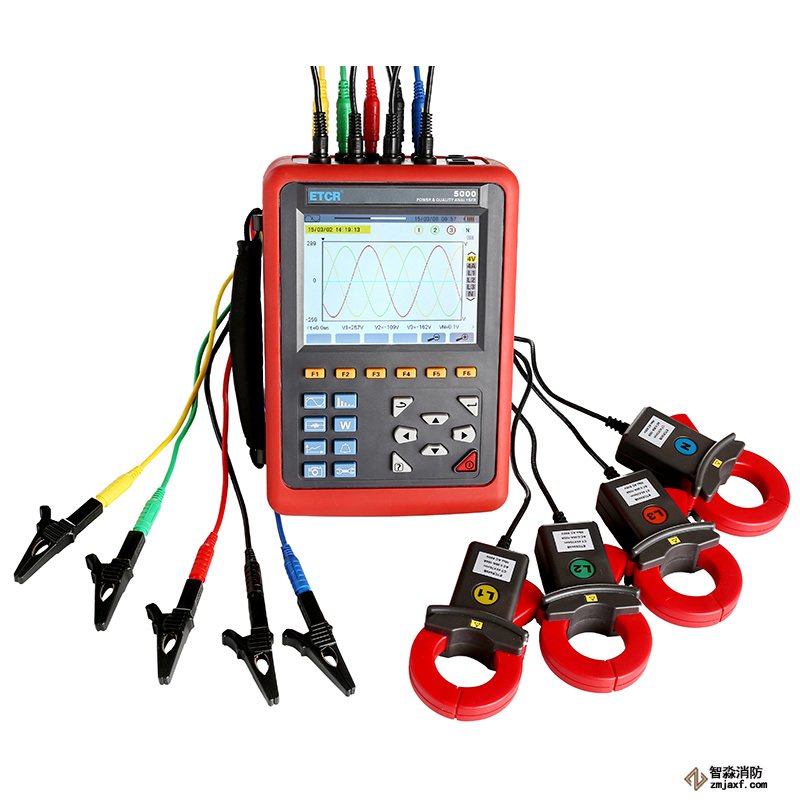 ETCR5000電能質(zhì)量分析儀采用DSP+ARM雙處理器架構,DSP負責數(shù)據(jù)的采集及算法處理,ARM負責通信協(xié)議及人機接口處理;模擬信號采集用2片ADI公司分辨率為16位的4通道同步采樣的AD7655完成,實現(xiàn)蕞高采樣速率達到1MSPS,保證了通道的精度和信息完整性,保證了不錯過電網(wǎng)中任何一個瞬態(tài)變化,使對瞬態(tài)波形、驟升驟降、瞬時中斷等的偵測更加的精準;DSP工作頻率達200MHz以上,能夠及時監(jiān)測電網(wǎng)并動態(tài)調(diào)整采樣頻率實現(xiàn)工頻和采樣頻率同步;采用5.6寸LCD彩屏顯示,分辨率為640dots×480dots,用不同顏色 區(qū)別顯示各相的參數(shù)、波形圖、相量圖、諧波比圖,使用戶可以更高效更直觀地了解電網(wǎng)參數(shù)狀態(tài)。內(nèi)置閃存可同時存儲60組屏幕截圖,150組瞬態(tài)電壓/電流捕捉波形圖,12800組告警日志,啟動電流偵測模式可連續(xù)捕捉100s的啟動電流波形。內(nèi)置2G內(nèi)存卡用于存儲長時間趨勢曲線記錄,同時記錄20個電量參數(shù)(可根據(jù)需要選擇),5s采集記錄一次,可記錄存儲長達300天的趨勢曲線記錄。