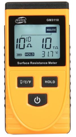 GM3110是一款物體表面電阻測試儀,將儀器的兩根平行的電極貼緊被測物體的表面,就可以測量物體表面的電阻值,從而判斷被測物體是導體,防靜電材料,還是絕緣體,同時該儀器還可以測量物體對地電阻。儀器特別適用于各種防靜電領域。