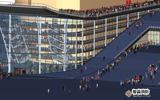-Pathfinder還專門提供了高性能可視化的3D時間歷程模擬,利用透明化功能來更好地顯示密集人群在樓層中的疏散情況。
